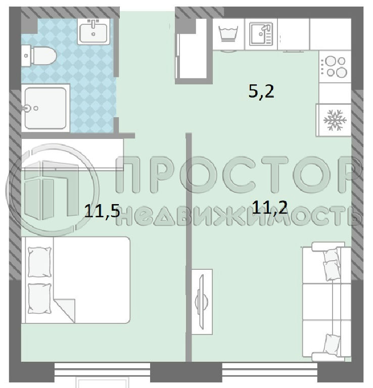 Общая площадь квартиры составляет 34.8 кв.м, с просторной кухней 16,4кв.м и жилой площадью 11,5 кв.м.